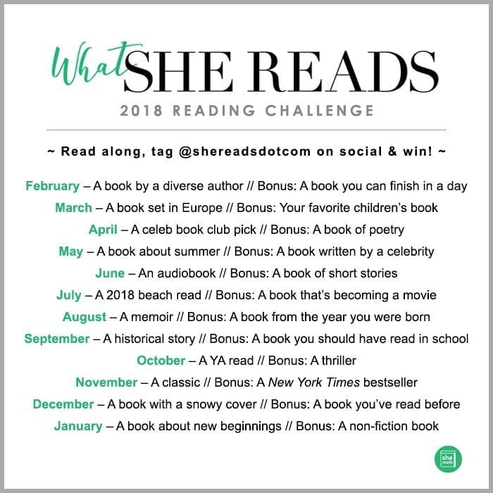 Raise your latté if you love a good reading challenge? We do, we do! With so many amazing books coming out this year (see the list here!) plus beautiful #bookstagrams to look at every day (take a look!), our #TBR pile is getting a little tipsy. That’s why we created the 2018 She Reads Reading Challenge. It’s just one book a month (maybe two if you’re up for a bonus) and gives you a simple theme to follow but lets you pick any book that fits that theme. Plus, we’ll be reading along with you each month, giving you lots of book recommendations, AND looking for your social posts to award fun giveaway prizes so be sure to tag @shereadsdotcom in all your reading posts.