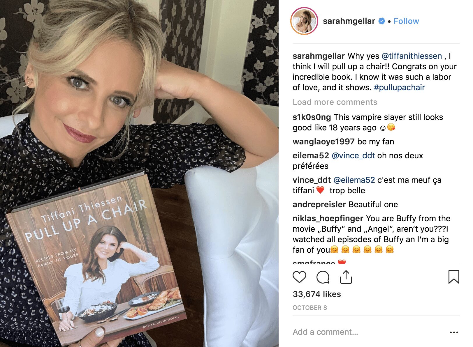 Sarah Michelle Gellar is reading Pull Up A Chair: Recipes from My Family to Yours by Tiffani Thiessen